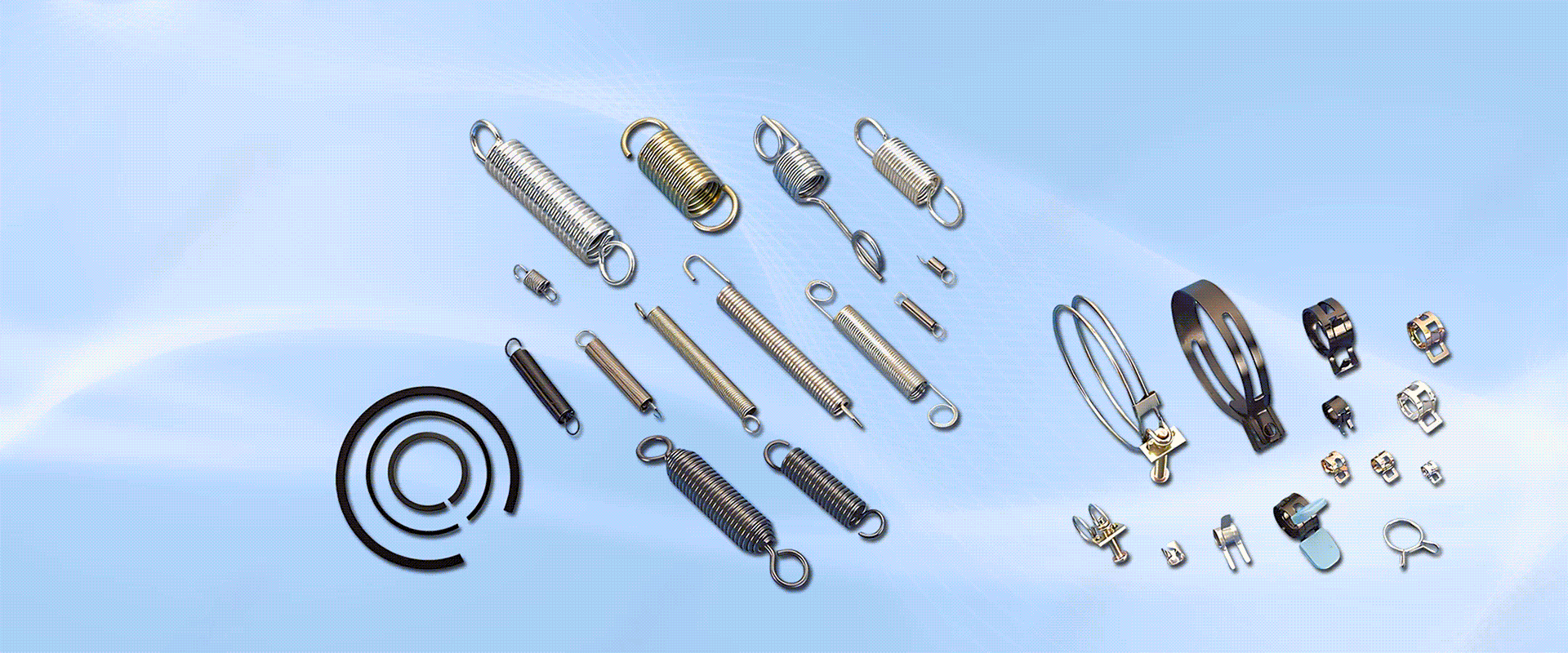S鉤、鉤環、扣環、釦環、吊鉤、背帶扣、管夾、管束、電子精密彈簧、鈎環、彈片、扁簧、扭簧、拉伸彈簧、壓縮彈簧、塔型彈簧、磨平壓簧、錐形彈簧、扭力彈簧、平衡插片、插座銅片、卡簧、插梢、針車壓腳彈片、針車專用五金配件、吸盤吊鉤、銅五金製品、304彈簧把手、卡圈